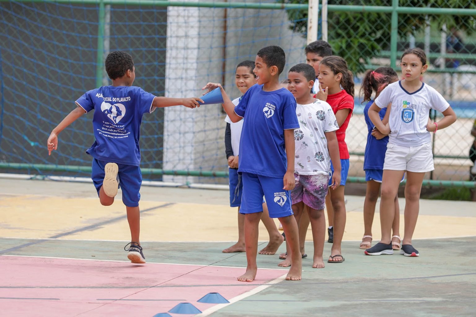 Os irmãos Glória Maria Silva Lima, 6 anos, e Levi Silva Lima, 9, diagnosticados com transtorno do espectro autista (TEA), estão aproveitando cada momento da colônia. Glória se encantou com as brincadeiras da gincana, como pique-pega e pique-esconde, enquanto Levi está ansioso para ver sua equipe vencer a competição.