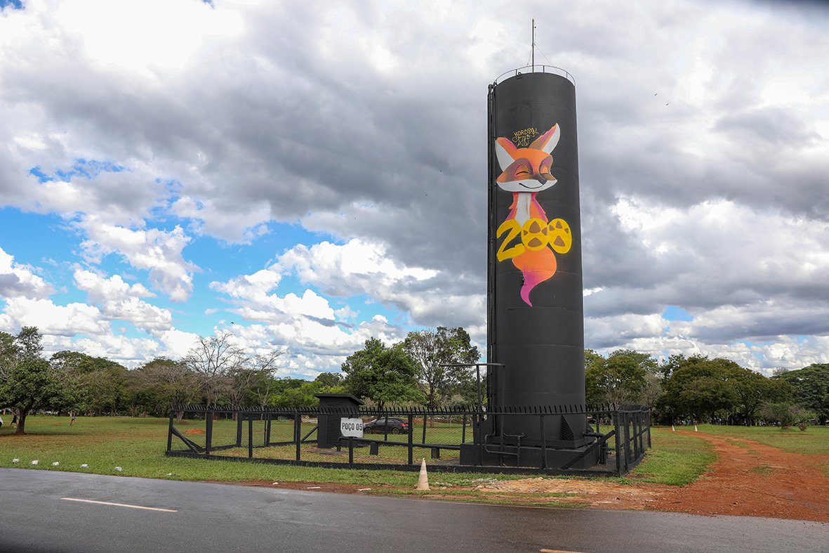 Um dos símbolos mais emblemáticos da Fundação Zoológico de Brasília está de cara nova. Visível para quem passa pela Estrada Parque Guará (DF-051), a caixa d’água foi reformada e ganhou uma ilustração que retrata a lobo-guará Atena, mascote oficial do zoo. O desenho foi assinado pelo artista brasiliense Douglas Kordyal, que pretende completar a arte com uma homenagem à girafa Yaza, falecida em março deste ano, aos 21 anos.