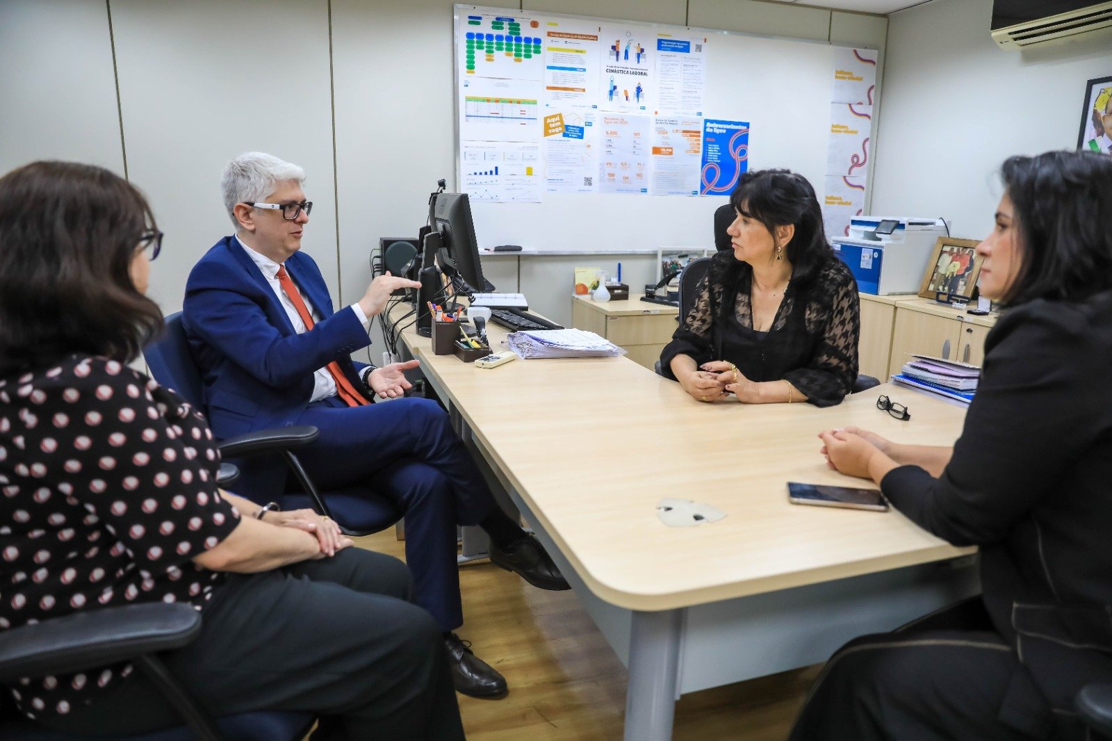 A diretora da Egov-DF, Juliana Tolentino, foi a responsável por apresentar o espaço ao coordenador da Egesp, Bruno Noroes de Magalhães, e à chefe de Capacitação Intersetorial da instituição paulista, Cláudia Antico.