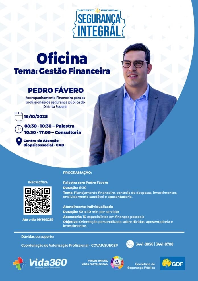 A Secretaria de Segurança Pública do Distrito Federal (SSP-DF) realizará, na próxima quinta-feira (16), a última edição da Oficina de Gestão Financeira do programa Movimento Vida 360. A formação será realizada no Centro de Atenção Biopsicossocial (CAB), a partir das 8h30. As inscrições terminam nesta terça (14).